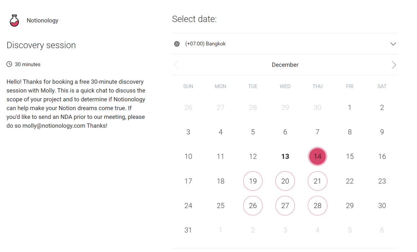 I use the app TidyCal (by AppSumo) to make this process simple. Before scheduling a meeting, clients must input their project budget. Given that Notion Consulting is a relatively new and evolving field, it's not unusual for people to be unsure about their budget, and that’s fine. As long as they can afford 1-2 hours of your time, you should be able to provide them with some basic guidance, and hopefully an upsell to a complete workspace build. In that case, I’m always ready and willing to jump on a discovery call and learn more about their goals. If their budget is far less than even your hourly rate, create a templated response that can easily be sent to the prospect outlining some other options that may be better suited for their budget. If you’d like, send them over to the Notion Consultants Directory where there is a broad range of Consultants for every budget.